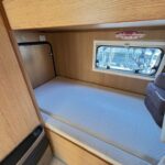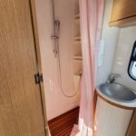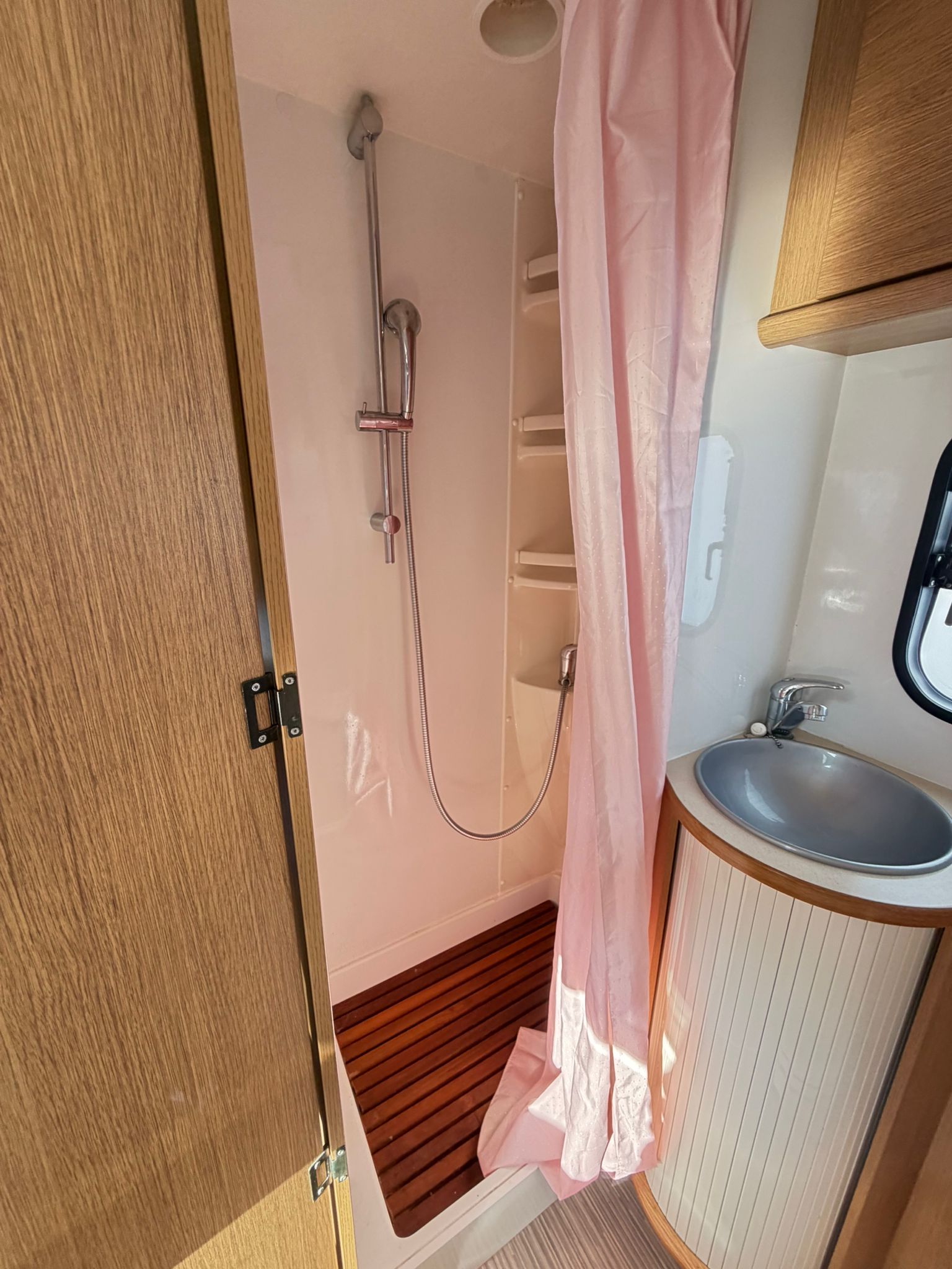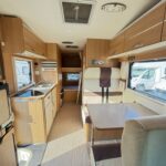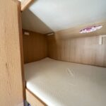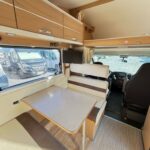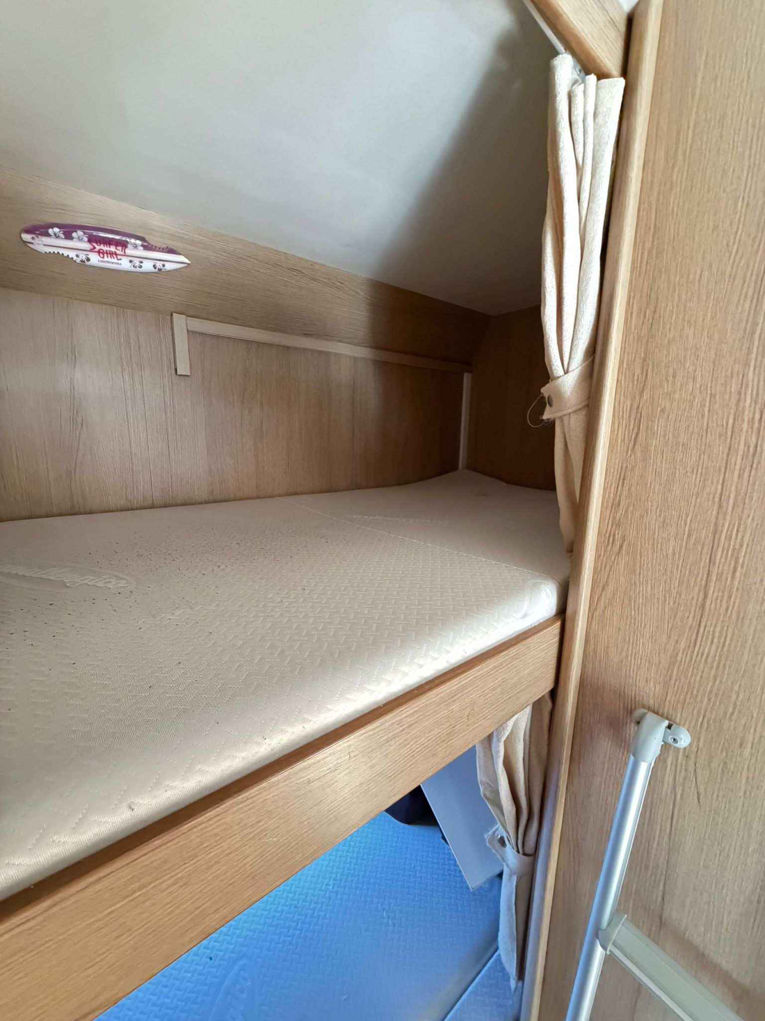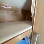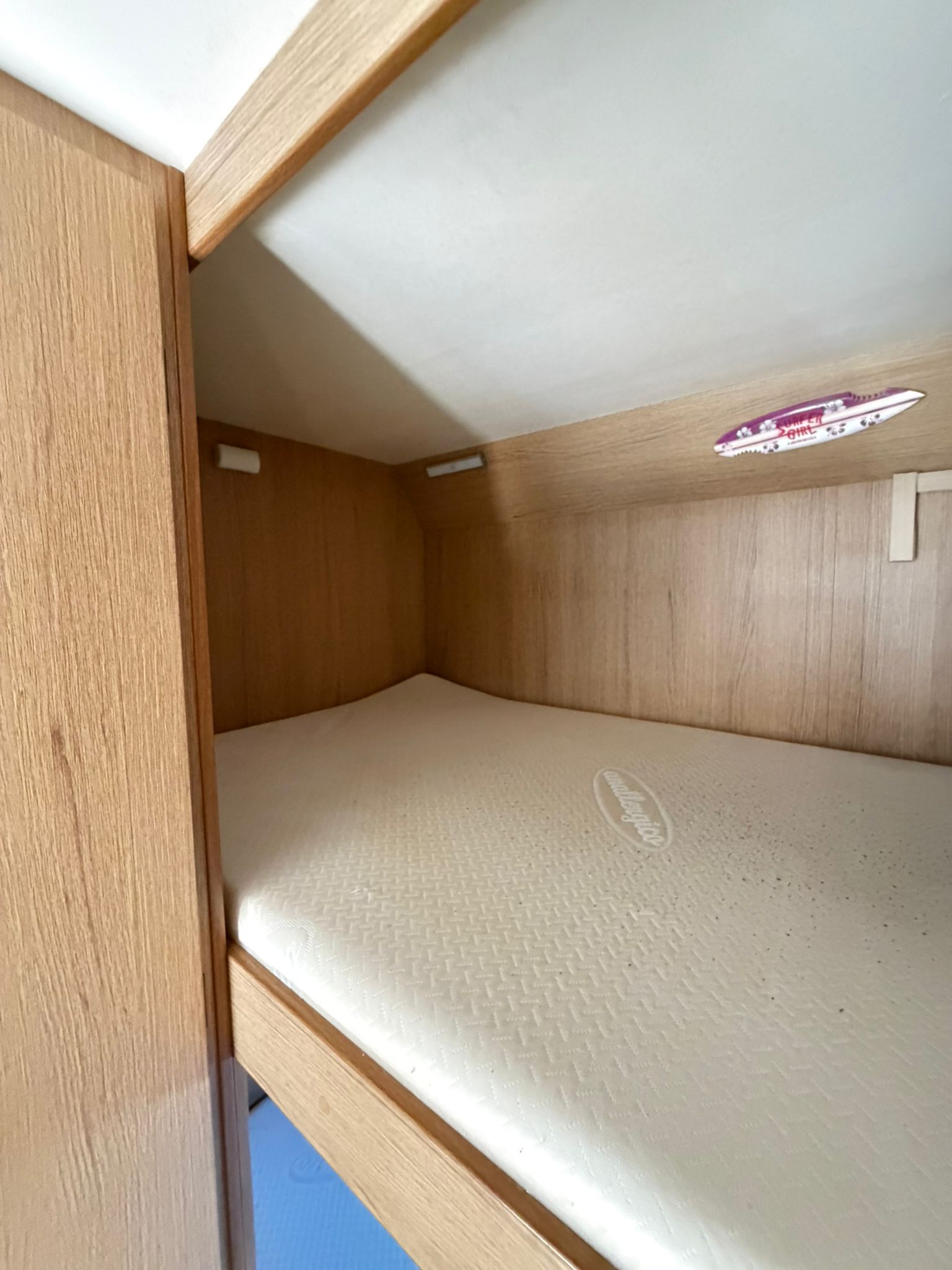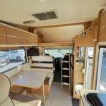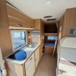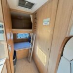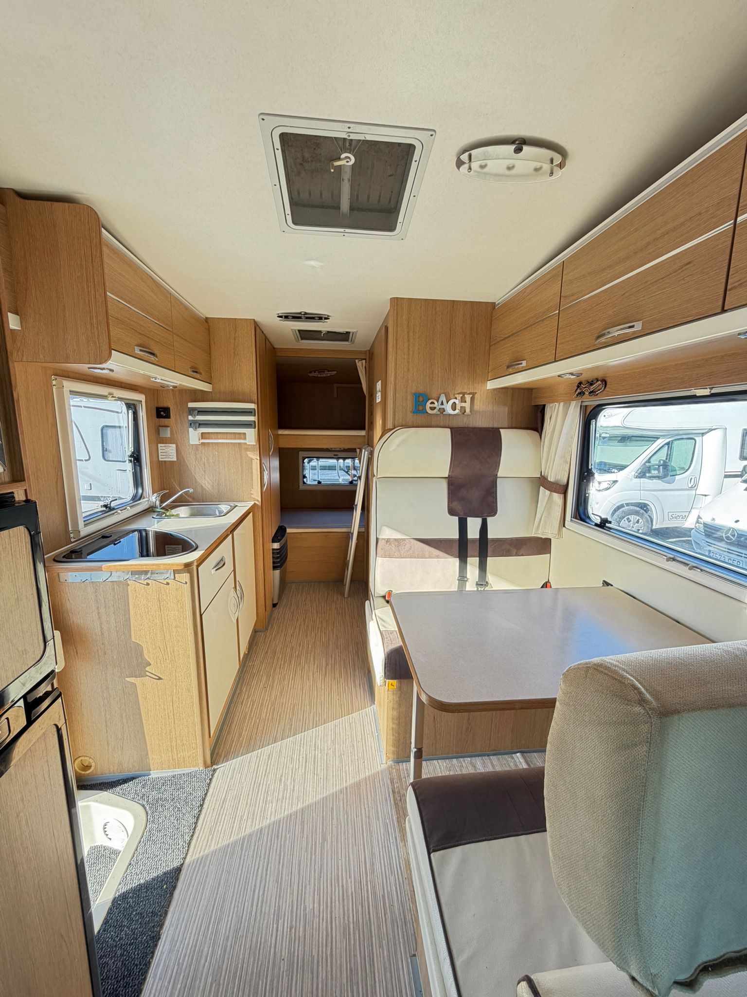 distribución y descanso dos literas traseras transversales (90 cm)  cama capuchina delantera sobre cabina (150 x 210 cm) salón convertible en cama grande (140 x 210 cm) zona de vivienda: salón amplio para 6 personas, cocina en l totalmente equipada, nevera grande, baño amplio, con ducha separada y mampara